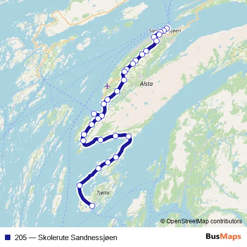 The first stop of the 205 bus route is Sandnessjøen bussterminal and the last stop is Tjøtta kai. 205 (Skolerute Sandnessjøen) is operational during på hverdager.