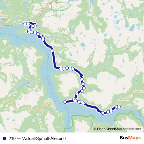 The first stop of the 210 bus route is Sjøholt and the last stop is Valldal sentrum. 210 (Valldal-Sjøholt-Ålesund) is operational during hver dag.