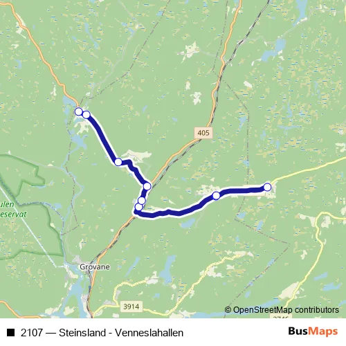 The first stop of the 2107 bus route is Samkom skole and the last stop is Jeppestøl nord. 2107 (Steinsland - Venneslahallen) is operational during på hverdager.