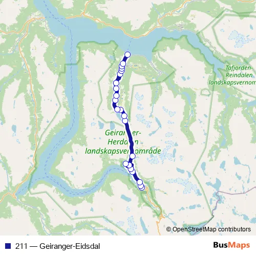 The first stop of the 211 bus route is Union Hotell Geiranger and the last stop is Eidsdal ferjekai. 211 (Geiranger-Eidsdal) is operational during hver dag.