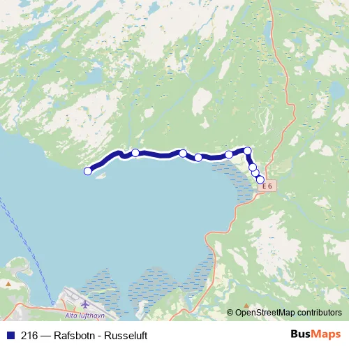 The first stop of the 216 bus route is Rafsbotn skole and the last stop is Russeluft. 216 (Rafsbotn - Russeluft) is operational during på hverdager.