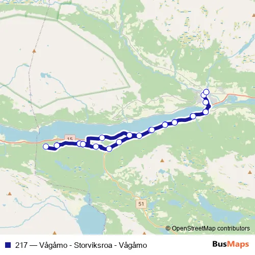 The first stop of the 217 bus route is Vågåmo rutebilstasjon and the last stop is Vågåmo rutebilstasjon. 217 (Vågåmo - Storviksroa - Vågåmo) is operational during på hverdager.