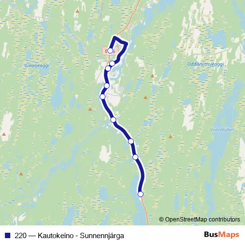 The first stop of the 220 bus route is Kautokeino Cirkle K and the last stop is Sunnennjárga. 220 (Kautokeino - Sunnennjárga) is operational during på hverdager.