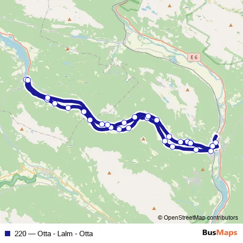 The first stop of the 220 bus route is Otta skysstasjon and the last stop is Otta skysstasjon. 220 (Otta - Lalm - Otta) is operational during på hverdager.