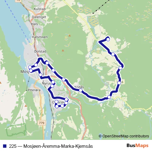 The first stop of the 225 bus route is Olderskog skole and the last stop is Vefsn landbruksskole. 225 (Mosjøen-Åremma-Marka-Kjemsås) is operational during på hverdager.