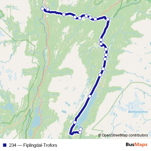 The first stop of the 234 bus route is Trofors stasjon and the last stop is Granlia. 234 (Fiplingdal-Trofors) is operational during på hverdager.