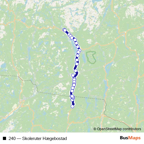 The first stop of the 240 bus route is Bryggeså and the last stop is Snartemo stasjon. 240 (Skoleruter Hægebostad) is operational during på hverdager.