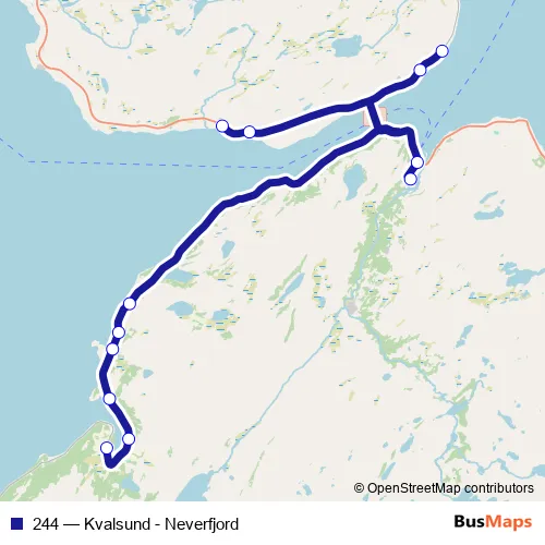The first stop of the 244 bus route is Gammelskolen Neverfjord and the last stop is Kvalsund nye skole. 244 (Kvalsund - Neverfjord) is operational during på hverdager.