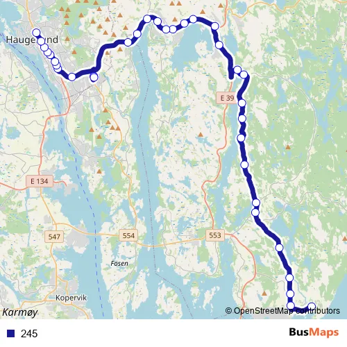 The first stop of the 245 bus route is Årvik and the last stop is Haugesund bussterminal 2. 245 is operational during på hverdager.
