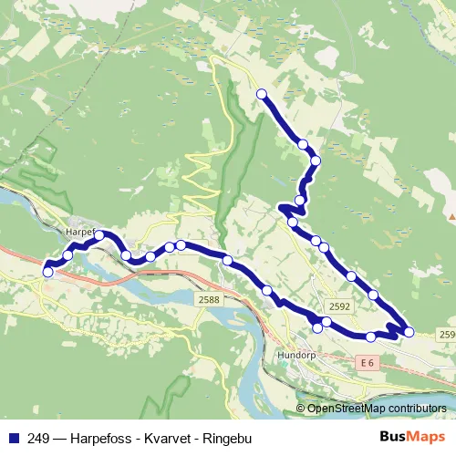 The first stop of the 249 bus route is Harpefoss skule and the last stop is Kvarvet. 249 (Harpefoss - Kvarvet - Ringebu) is operational during på hverdager.