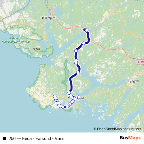 The first stop of the 256 bus route is Feda terminal and the last stop is Vanse rutebilgården. 256 (Feda - Farsund - Vans) is operational during på hverdager.