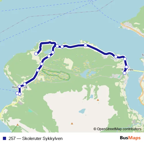 The first stop of the 257 bus route is Sørestranda skule and the last stop is Hundeidvik ferjekai. 257 (Skoleruter Sykkylven) is operational during på hverdager.