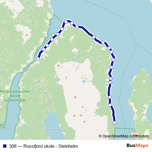 The first stop of the 308 bus route is Steinheim and the last stop is Rossfjord skole. 308 (Rossfjord skole - Steinheim) is operational during på hverdager.