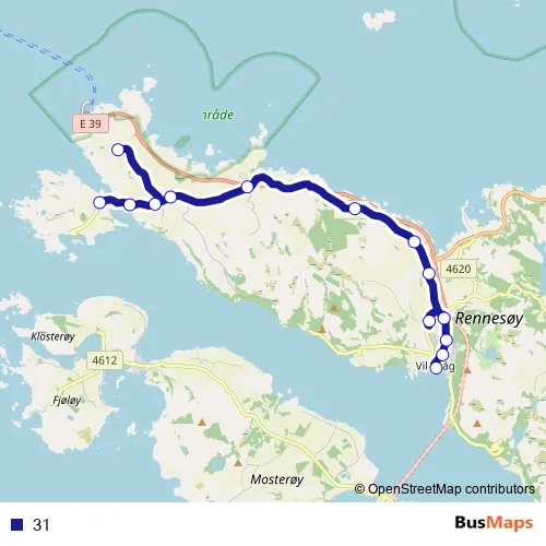 The first stop of the 31 bus route is Vikevåg kai and the last stop is Galta. 31 is operational during på hverdager.