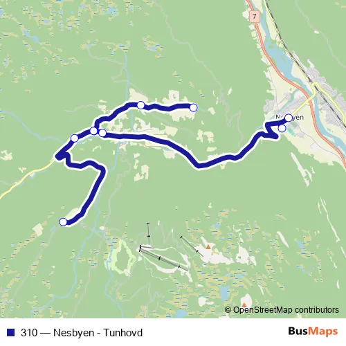 The first stop of the 310 bus route is Trondrudmarka and the last stop is Nesbyen sentrum. 310 (Nesbyen - Tunhovd) is operational during på hverdager.