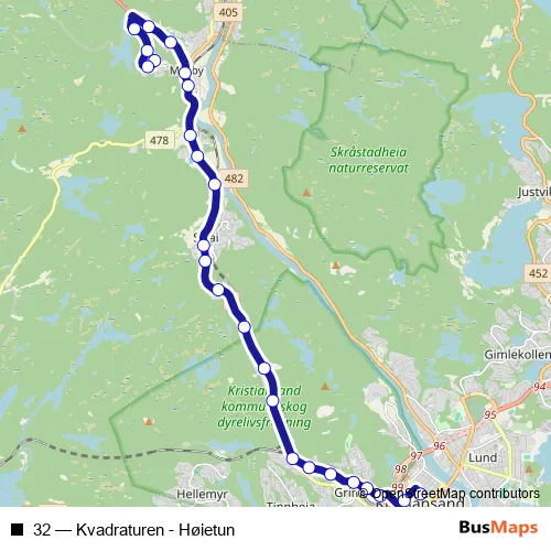 See why over 2 million users trust and consider busmaps.com as the best public transport website. busmaps gives you Kristiansand Buses suggested routes, real-time bus tracker, line route maps in Kristiansand, and helps to find the closest 32 bus stops near you. No internet available? Download an offline PDF map and bus schedule for the 32 bus to take on your trip.
