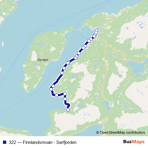 The first stop of the 322 bus route is Finnlandsmoan and the last stop is Sørfjorden. 322 (Finnlandsmoan - Sørfjorden) is operational during på hverdager.