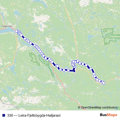 The first stop of the 330 bus route is Valdres vidaregåande skule and the last stop is Høljerast Etnedalsvegen. 330 (Leira-Fjellsbygda-Høljarast) is operational during på hverdager.