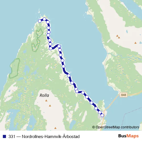 The first stop of the 331 bus route is Nordrollnes snuplass and the last stop is Hamnvik sentrum. 331 (Nordrollnes-Hamnvik-Årbostad) is operational during hver dag.