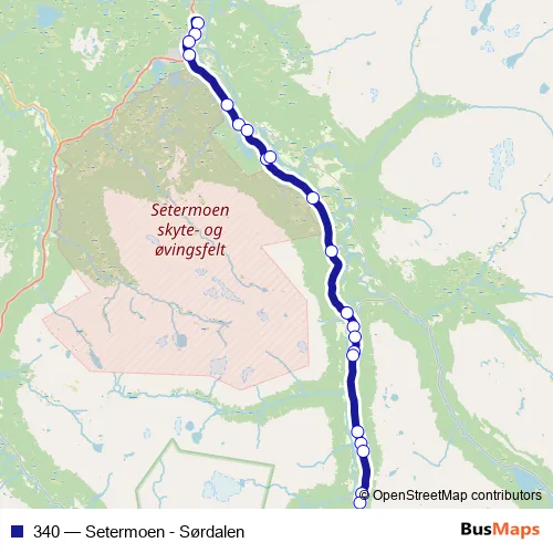 The first stop of the 340 bus route is Bardu Skole and the last stop is Sørmo. 340 (Setermoen - Sørdalen) is operational during på hverdager.