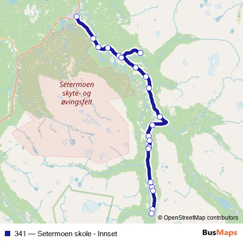 The first stop of the 341 bus route is Setermoen and the last stop is Sørmo. 341 (Setermoen skole - Innset) is operational during på hverdager.