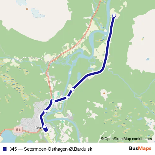 The first stop of the 345 bus route is Setermoen and the last stop is Østhagen. 345 (Setermoen-Østhagen-Ø.Bardu sk) is operational during på hverdager.