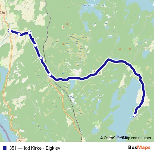 The first stop of the 351 bus route is Idd kirke and the last stop is Elgklev. 351 (Idd Kirke - Elgklev) is operational during hver dag.