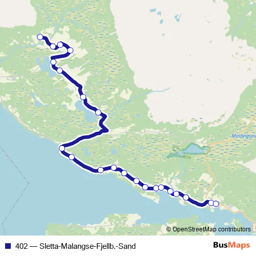 The first stop of the 402 bus route is Kjernberg and the last stop is Malangen skole. 402 (Sletta-Malangse-Fjellb.-Sand) is operational during på hverdager.