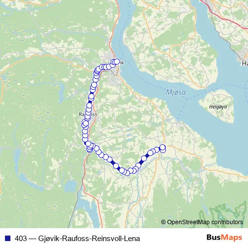 The first stop of the 403 bus route is Lena skysstasjon and the last stop is Gjøvik skysstasjon. 403 (Gjøvik-Raufoss-Reinsvoll-Lena) is operational during på hverdager.