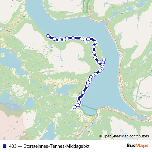 The first stop of the 403 bus route is Middagsbukta Brattli and the last stop is Storsteinnes skole. 403 (Storsteinnes-Tennes-Middagsbkt) is operational during på hverdager.