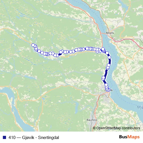 The first stop of the 410 bus route is Gjøvik skysstasjon and the last stop is Forbrukslaget. 410 (Gjøvik - Snertingdal) is operational during hver dag.