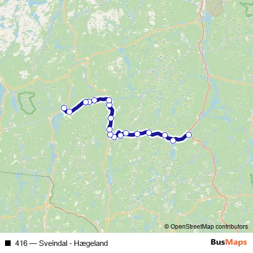 The first stop of the 416 bus route is Hægeland and the last stop is Byremo. 416 (Sveindal - Hægeland) is operational during hver dag.