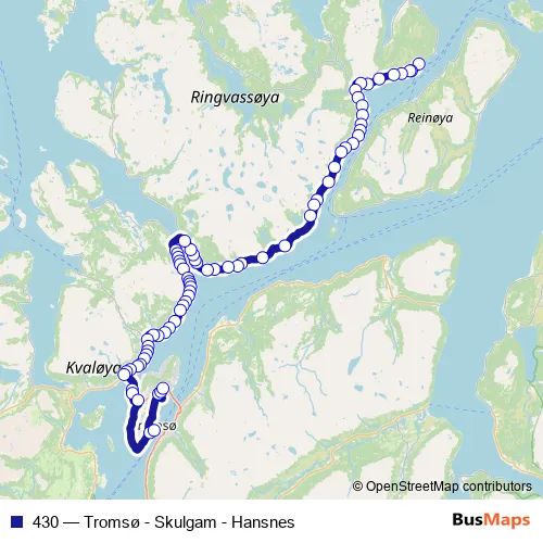 The first stop of the 430 bus route is Hansnes ferjekai and the last stop is Unn. 430 (Tromsø - Skulgam - Hansnes) is operational during hver dag.