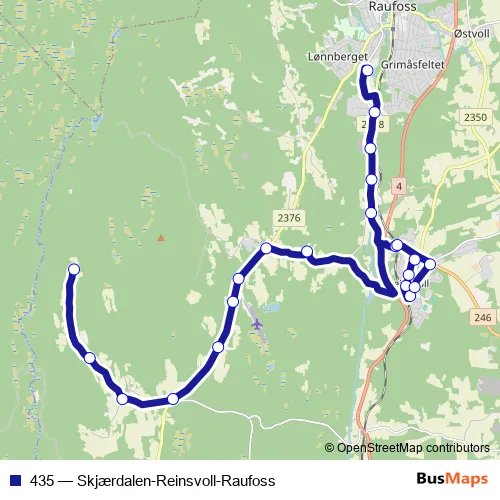The first stop of the 435 bus route is Raufosshallen and the last stop is Skjærdalen. 435 (Skjærdalen-Reinsvoll-Raufoss) is operational during på hverdager.