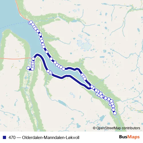 The first stop of the 470 bus route is Olderdalen ferjekai and the last stop is Manndalen skole. 470 (Olderdalen-Manndalen-Løkvoll) is operational during på hverdager.