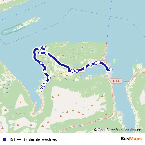 The first stop of the 491 bus route is Tomrefjord skule and the last stop is Vestnes. 491 (Skolerute Vestnes) is operational during på hverdager.
