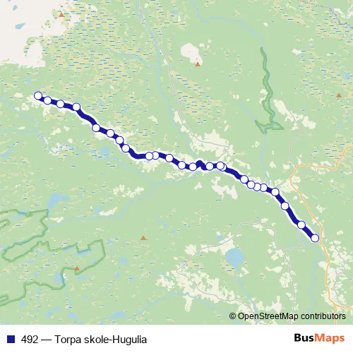 The first stop of the 492 bus route is Torpa barne- og ungdomsskole and the last stop is Hugulia. 492 (Torpa skole-Hugulia) is operational during på hverdager.