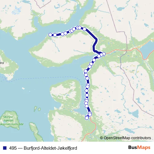 The first stop of the 495 bus route is Jøkelfjord and the last stop is Kvænangen skole. 495 (Burfjord-Alteidet-Jøkelfjord) is operational during på hverdager.