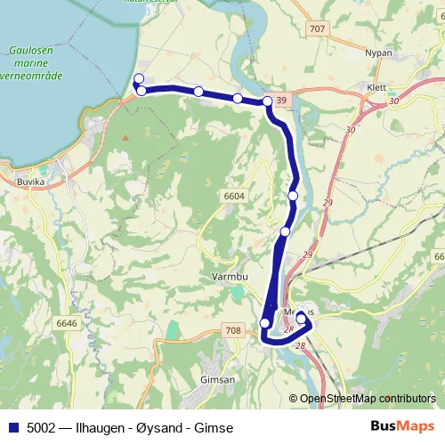 The first stop of the 5002 bus route is Melhus skysstasjon and the last stop is Øysand camping. 5002 (Ilhaugen - Øysand - Gimse) is operational during på hverdager.