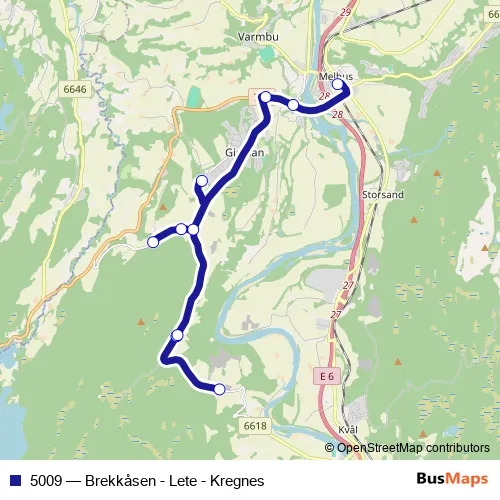 The first stop of the 5009 bus route is Melhus skysstasjon and the last stop is Sjetnan. 5009 (Brekkåsen - Lete - Kregnes) is operational during på hverdager.