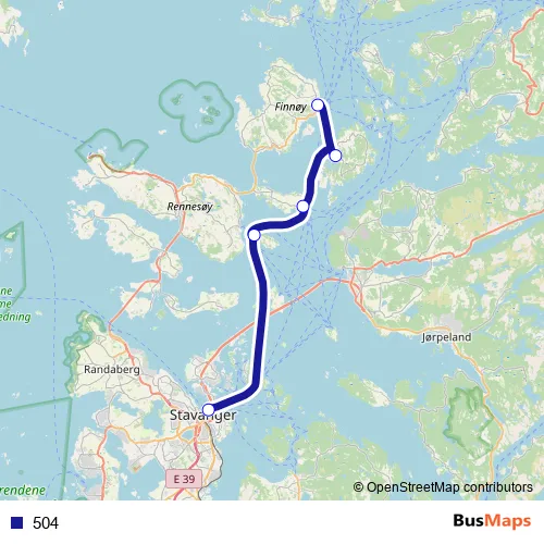 The first stop of the 504 ferry route is Fiskepirterminalen and the last stop is Judaberg hurtigbåtkai. 504 is operational during hver dag.
