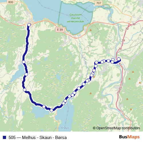 The first stop of the 505 bus route is Melhus skysstasjon and the last stop is Børskrysset E39. 505 (Melhus - Skaun - Børsa) is operational during på hverdager.