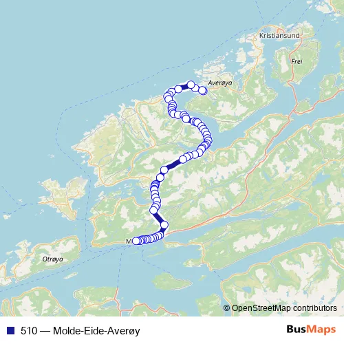 The first stop of the 510 bus route is Kårvåg Atlanterhavsvegen and the last stop is Molde trafikkterminal. 510 (Molde-Eide-Averøy) is operational during hver dag.