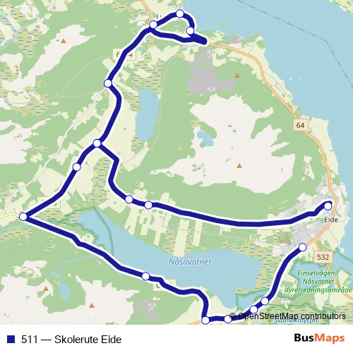 The first stop of the 511 bus route is Eide Auto and the last stop is Høgset fv. 279. 511 (Skolerute Eide) is operational during på hverdager.