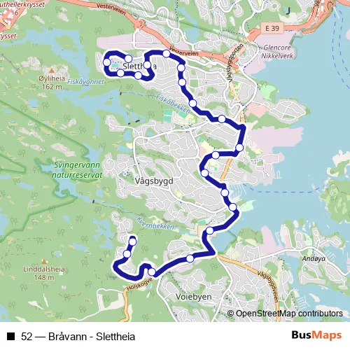 The first stop of the 52 bus route is Bråvann snuplass and the last stop is Slettheiveien 41. 52 (Bråvann - Slettheia) is operational during hver dag.