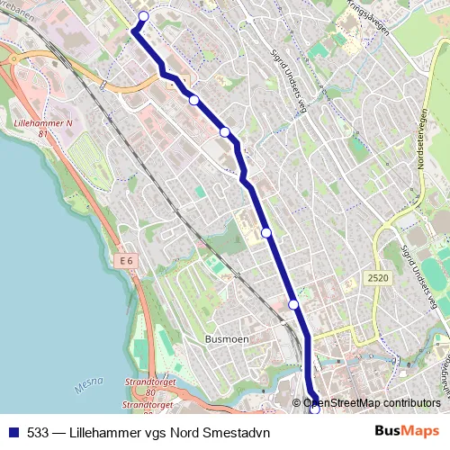 The first stop of the 533 bus route is Lillehammer vgs Nord Smestadvegen and the last stop is Lillehammer skysstasjon. 533 (Lillehammer vgs Nord Smestadvn) is operational during på hverdager.