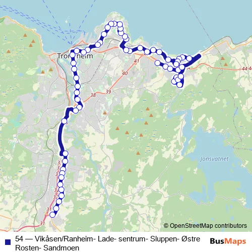 The first stop of the 54 bus route is Askeladdvegen and the last stop is Sandmoen. 54 (Vikåsen/Ranheim- Lade- sentrum- Sluppen- Østre Rosten- Sandmoen) is operational during hver dag.