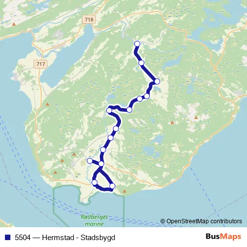 The first stop of the 5504 bus route is Stadsbygd skole and the last stop is Denstad. 5504 (Hermstad - Stadsbygd) is operational during på hverdager.