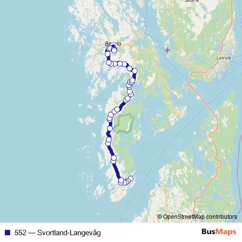 The first stop of the 552 bus route is Langevåg kai and the last stop is Svortland terminal. 552 (Svortland-Langevåg) is operational during hver dag.