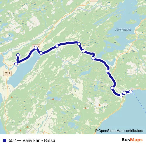 The first stop of the 552 bus route is Rissa skysstasjon and the last stop is Vanvikan. 552 (Vanvikan - Rissa) is operational during på hverdager.
